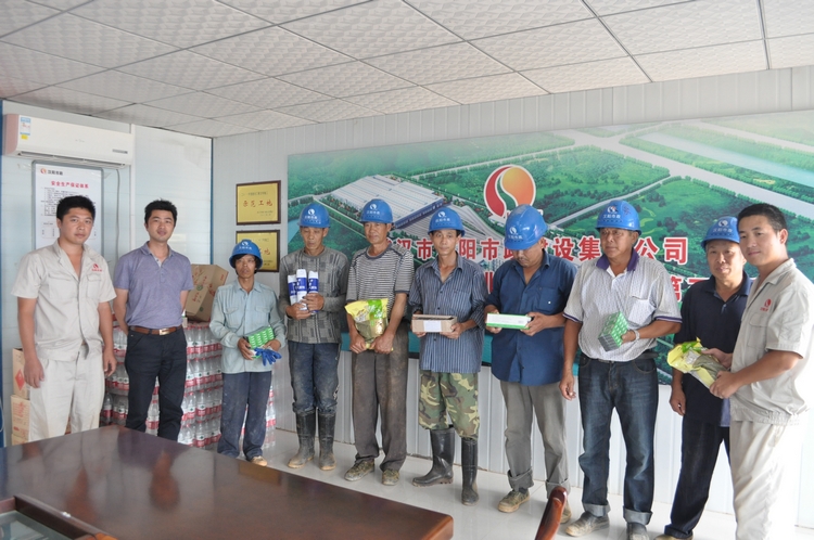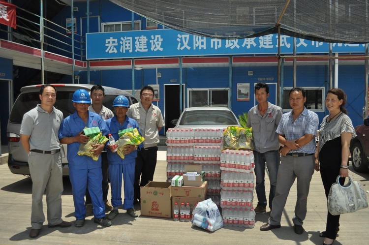 6月17日,武漢市氣象局發(fā)布高溫黃色預(yù)警。鐘鑫公司立即開(kāi)展了夏季高溫慰問(wèn)活動(dòng)。當(dāng)天下午,公司經(jīng)理王智高、書記王繁、副經(jīng)理鄭佳、尹艷軍、徐浩及工會(huì)干部等領(lǐng)導(dǎo)一行冒著高溫酷暑慰問(wèn)漢口北地鐵項(xiàng)目部。在漢口北項(xiàng)目部,王智高經(jīng)理等領(lǐng)導(dǎo)把礦泉水、綠豆、白糖等物資和防暑降溫藥品發(fā)放到農(nóng)民工手中,并叮囑項(xiàng)目部一定要保證農(nóng)民工在高溫時(shí)期安全作業(yè),防暑降溫物資要有限用于農(nóng)民工。隨后兩天時(shí)間里,公司領(lǐng)導(dǎo)同志有先后為三號(hào)線六標(biāo)地鐵項(xiàng)目部、玉龍路地鐵項(xiàng)目部以及江鸚路道路維修項(xiàng)目部、佛祖嶺一路項(xiàng)目部和書城路項(xiàng)目部,并對(duì)現(xiàn)場(chǎng)農(nóng)民工進(jìn)行慰問(wèn)。