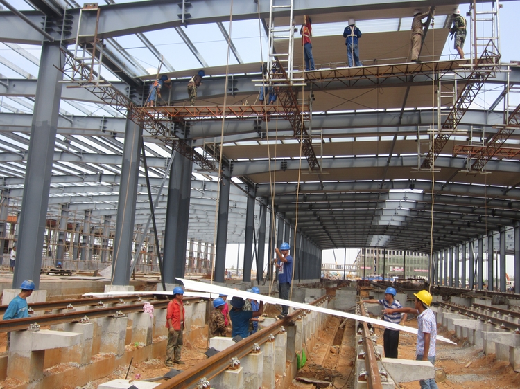 為確保施工節(jié)點(diǎn)工期,順利完成工程收尾攻堅(jiān)階段,公司堅(jiān)持緊密圍繞施工的各項(xiàng)指標(biāo),以“搶工期、保安全、保質(zhì)量、控造價(jià)”為目標(biāo),從嚴(yán)管理,強(qiáng)力推進(jìn),不遺余力的搶工期抓進(jìn)度。目前的工程重點(diǎn)是運(yùn)用鋼結(jié)構(gòu)、土建工程以及三個(gè)門衛(wèi)房,至今形象進(jìn)度鋼結(jié)構(gòu)的鋼柱鋼梁已全部完成,檁條安裝完成80%,屋面安裝完成了40%。由于天氣炎熱,鋼構(gòu)件的溫度可謂是“燙手”,大大增加了白天安裝的難度;運(yùn)用庫道床基礎(chǔ)基本完成,目前正在進(jìn)行附屬用房的砌體工程,與幾方的交叉作業(yè)是其施工難點(diǎn);門衛(wèi)房是常規(guī)的鋼筋混凝土結(jié)構(gòu),但門衛(wèi)房一的一層含分部夾層,建筑高度為11.4m,建筑面積為313.26㎡;門衛(wèi)房二、門衛(wèi)三(一層)建筑高度為4.3m,建筑面積為48.64㎡,都屬于異形結(jié)構(gòu),施工難度系數(shù)較高。另外還有邊坡防護(hù)、圍墻等分部工程同時(shí)進(jìn)行。