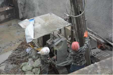 (圖為方紫微同志、涂軼銘同志向嚴悌文同志介紹施工情況)