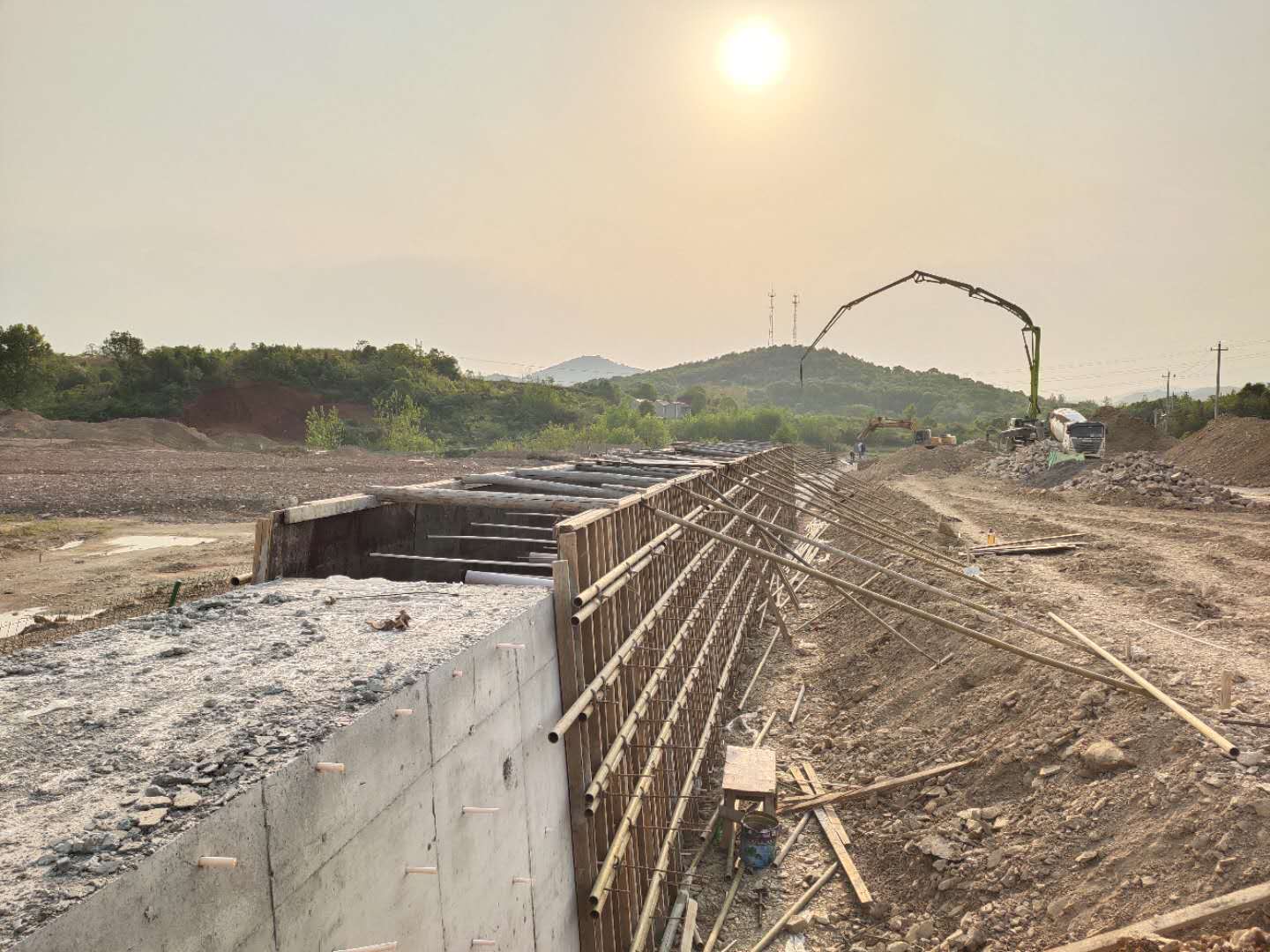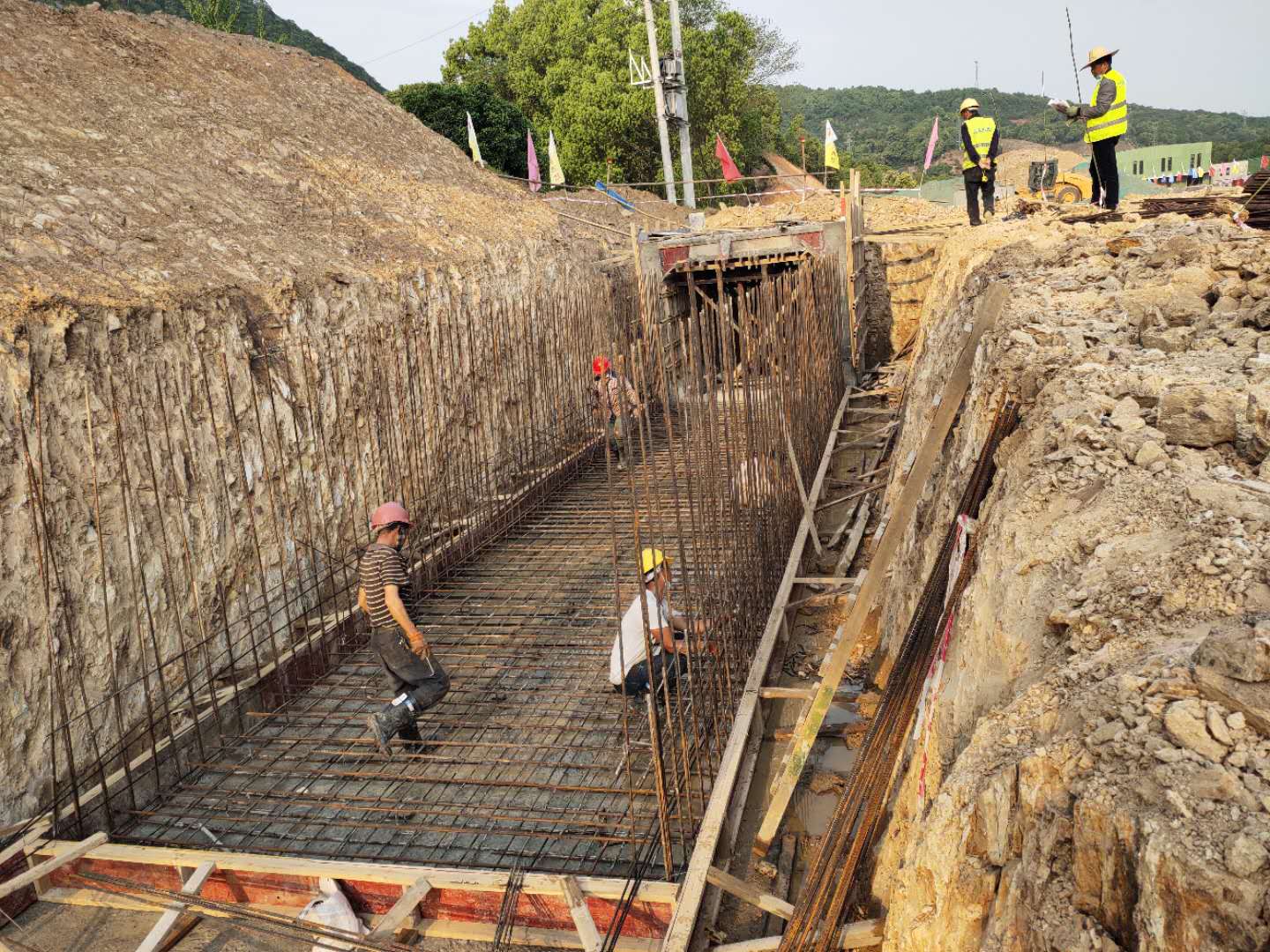 截止1月底,擋土墻施工完成300米,累計(jì)完成27%;雨水管道完成300米,累計(jì)完成27%;挖方完成6.6萬(wàn)方,累計(jì)完成63.2%;填方完成4萬(wàn)方,累計(jì)完成93.7%。受疫情影響,2個(gè)月處于停滯狀態(tài)。為保障項(xiàng)目安全有序復(fù)工,盡快把失去的工期“搶”回來(lái),該項(xiàng)目部第一時(shí)間了解當(dāng)?shù)貜?fù)工復(fù)產(chǎn)要求以及尋求武漢政策支持,分期分批進(jìn)駐項(xiàng)目現(xiàn)場(chǎng)。嚴(yán)格按照疫情防控方案落實(shí)各項(xiàng)工作,全體員工租住當(dāng)?shù)鼐用衩穹浚粭潈蓪樱謩e作為會(huì)議室和住宿,按照一人一間房安排住宿;項(xiàng)目現(xiàn)場(chǎng)通過(guò)微信群、宣傳標(biāo)語(yǔ)和現(xiàn)場(chǎng)展板等方式積極開(kāi)展宣傳,施工現(xiàn)場(chǎng)采取了封閉式管理、實(shí)行全員戴口罩,提前儲(chǔ)備了口罩、護(hù)目鏡、消毒水、溫度計(jì)等防疫物資,保障項(xiàng)目現(xiàn)場(chǎng)防疫物資不中斷;每日為項(xiàng)目人員測(cè)量體溫、入場(chǎng)檢測(cè)實(shí)名登記、進(jìn)入項(xiàng)目車輛及人員定時(shí)消毒和分批就餐等手段切實(shí)做好施工期間防疫工作。確保了防疫生產(chǎn)“兩不誤”。整個(gè)項(xiàng)目部團(tuán)結(jié)一心,鼓足干勁,奔著共同目標(biāo)毫不松懈,挑燈夜戰(zhàn)趕進(jìn)度,爭(zhēng)分奪秒搶工期。通過(guò)加大人、材、機(jī)的投入、增加斷面等多種方式加快施工,截止4月16日,擋土墻完成施工220米,累計(jì)完成520米,完成47.27%;截洪溝溝槽開(kāi)挖150米,混凝土澆筑100米,完成9%。工程進(jìn)度嚴(yán)格按總進(jìn)度計(jì)劃有序進(jìn)行。