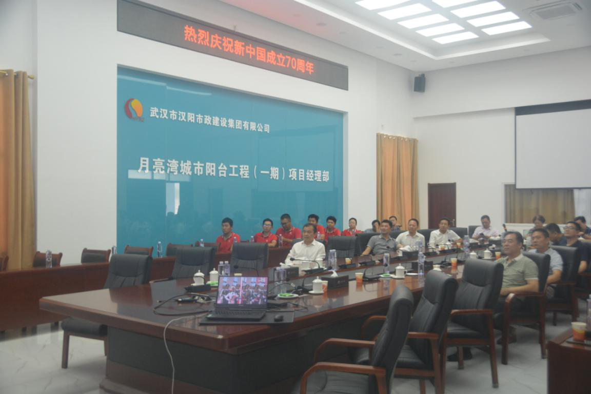嚴悌文一行首先來到月亮灣項目施工現(xiàn)場進行了實地調(diào)研,在董事長曹元鑫及項目經(jīng)理魏偉的介紹下了解了項目的概況、最新進展及遇到的重難點問題。他為建設在一線的工作人員送去了節(jié)日祝福,并對他們持續(xù)堅守、奮勇拼搏的精神表達了充分的認可和贊揚,希望項目建設人員繼續(xù)保持良好的工作勢頭,排除萬難,把月亮灣項目建設成為優(yōu)質(zhì)的精品工程。隨后,嚴悌文一行在月亮灣項目部會議室和公司領導及項目部員工一起觀看了盛大而濃重的國慶盛典,一起慶祝祖國70周年華誕。