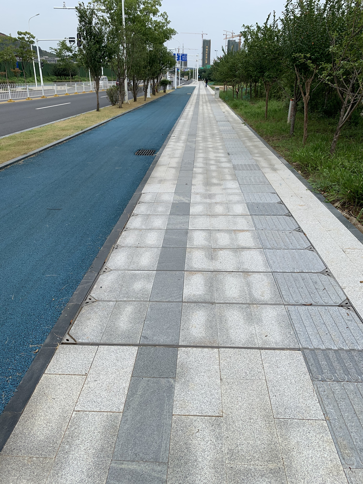 人行道鋪裝面整體采用芝麻灰花崗巖石材。設(shè)置特色芝麻黑條形裝飾帶、芝麻黑盲道,保證縫寬一致、線型直順、平整、美觀。非機動車道加鋪光谷藍彩色瀝青,不僅耐高溫、耐磨、抗滑,同時具有低碳環(huán)保的特點,形成一道亮麗的風景線。