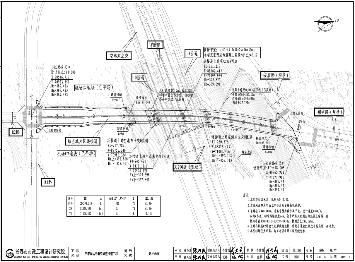 航空城片區(qū)連接道工程位于空港園區(qū)及航空城片區(qū),道路全長448.008m,等級為城市次干路,設(shè)計速度40km/h,標(biāo)準(zhǔn)路幅寬24m,雙向4車道。該項目南端起于航空城已建R3路,向北經(jīng)過江北機(jī)場規(guī)劃機(jī)務(wù)維修辦公區(qū)延伸上跨G319國道,終點止于空港園區(qū)安康路與翔宇路現(xiàn)狀交叉口。