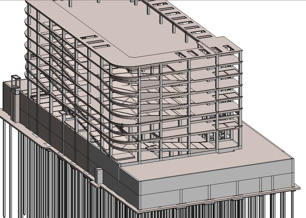 BIM技術(shù)提效率。面對(duì)停車樓從地下室至屋面的復(fù)雜的坡道結(jié)構(gòu),項(xiàng)目部積極采用BIM模型技術(shù)指導(dǎo)現(xiàn)場(chǎng)施工,用三維模型給工人技術(shù)交底,讓工人熟悉坡道的每一弧形梁與直梁的位置關(guān)系,更為精確地領(lǐng)會(huì)設(shè)計(jì)意圖,完全將圖紙吃透。
